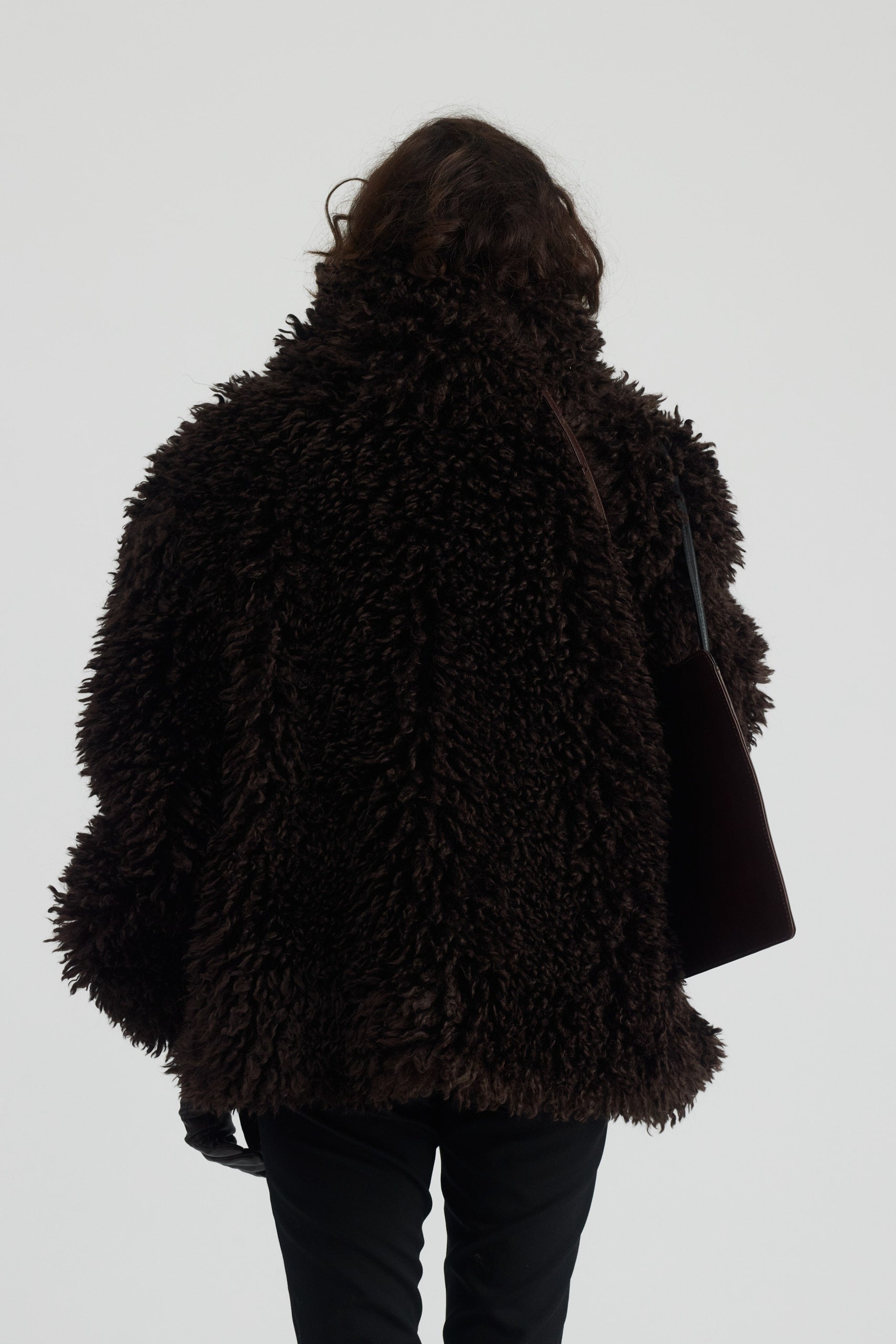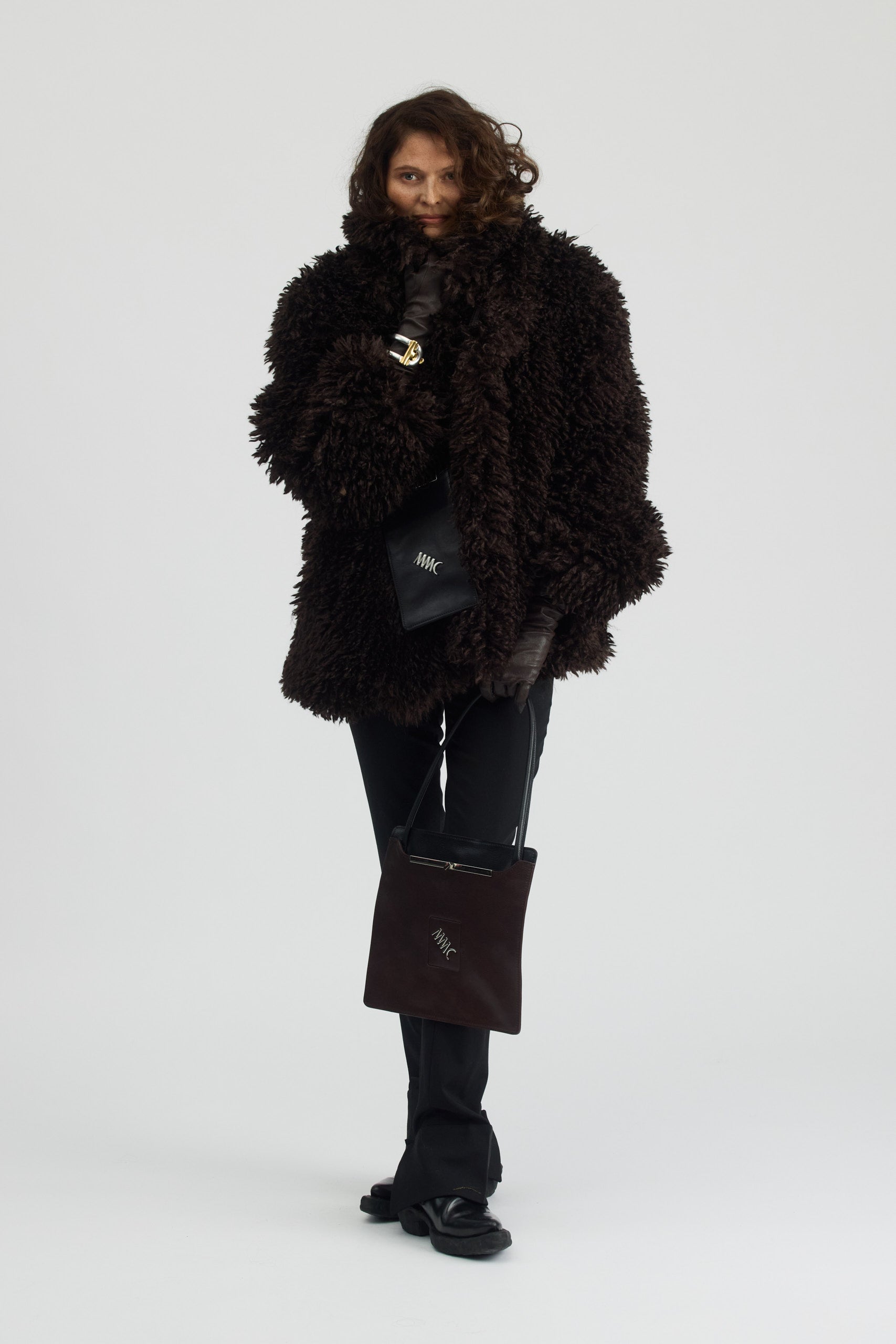 Obszerne futro w odcieniu ciemnej czekolady. Oversizowa forma daje komfort i pozwala dopasować płaszcz do każdej sylwetki a wyrazista faktura staje się mocnym elementem każdej stylizacji.