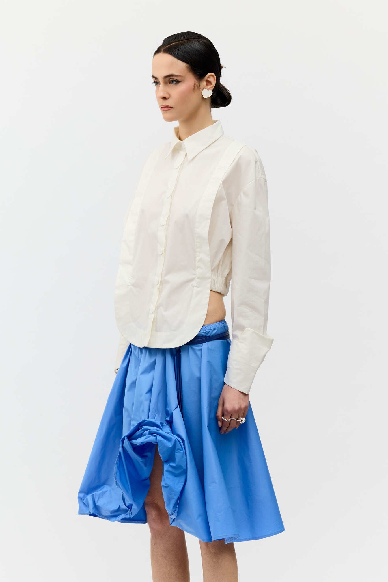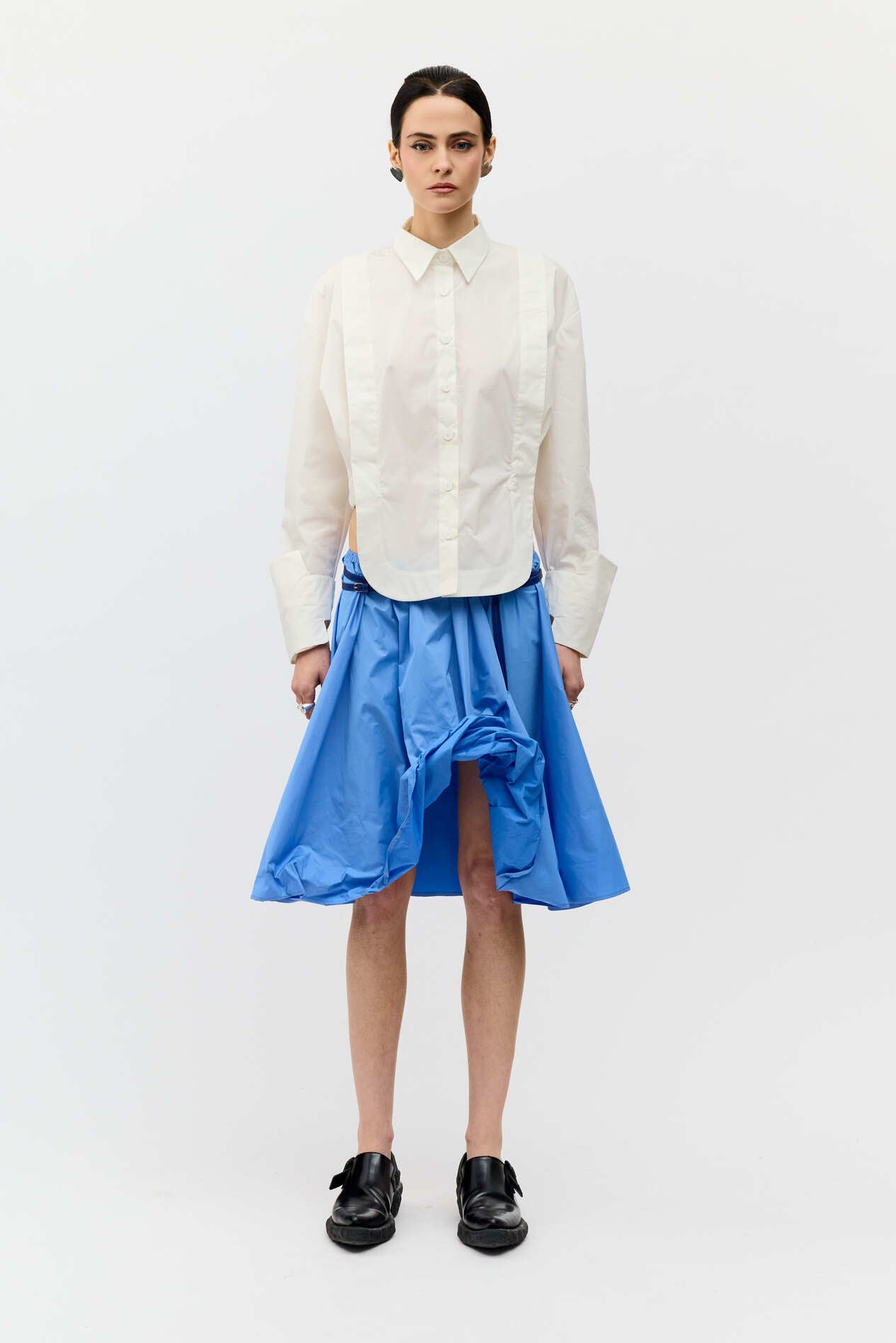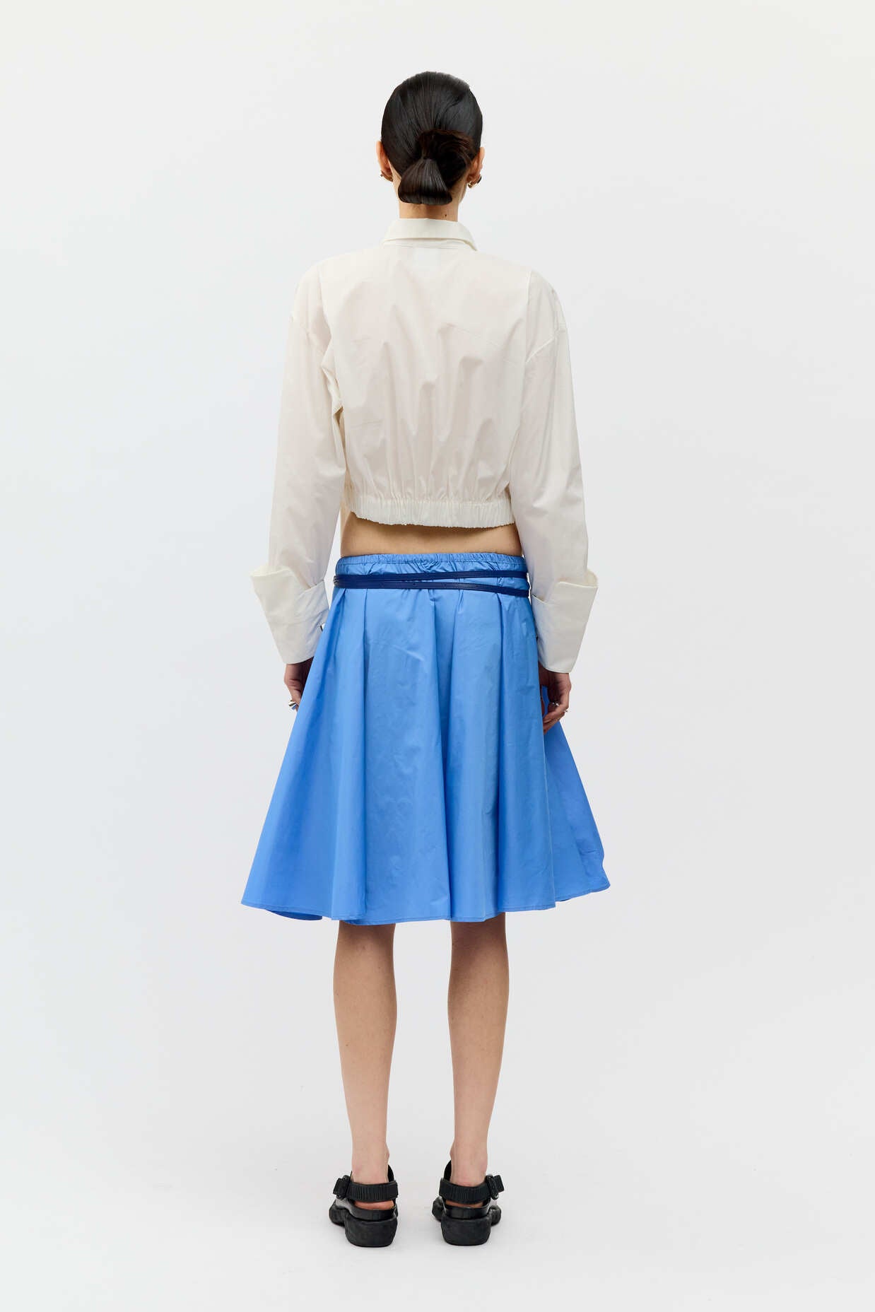 Spódnica o rozkloszowanym kroju w intensywnym odcieniu błękitu. Lekka, techniczna tkanina nadaje jej objętości, a wbudowany drucik pozwala na dowolne modelowanie formy. Elastyczny pas zapewnia komfort noszenia i dopasowanie do sylwetki.