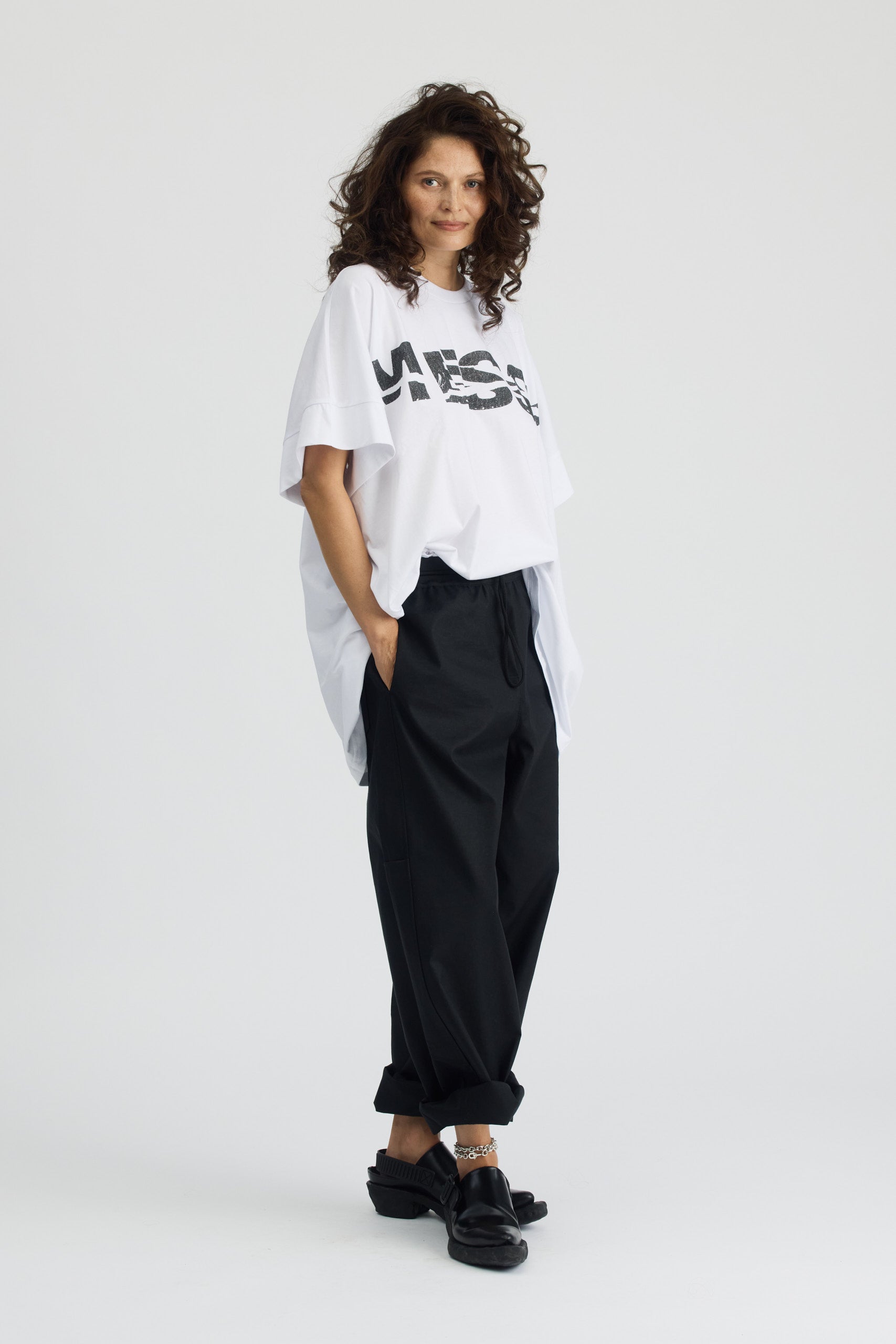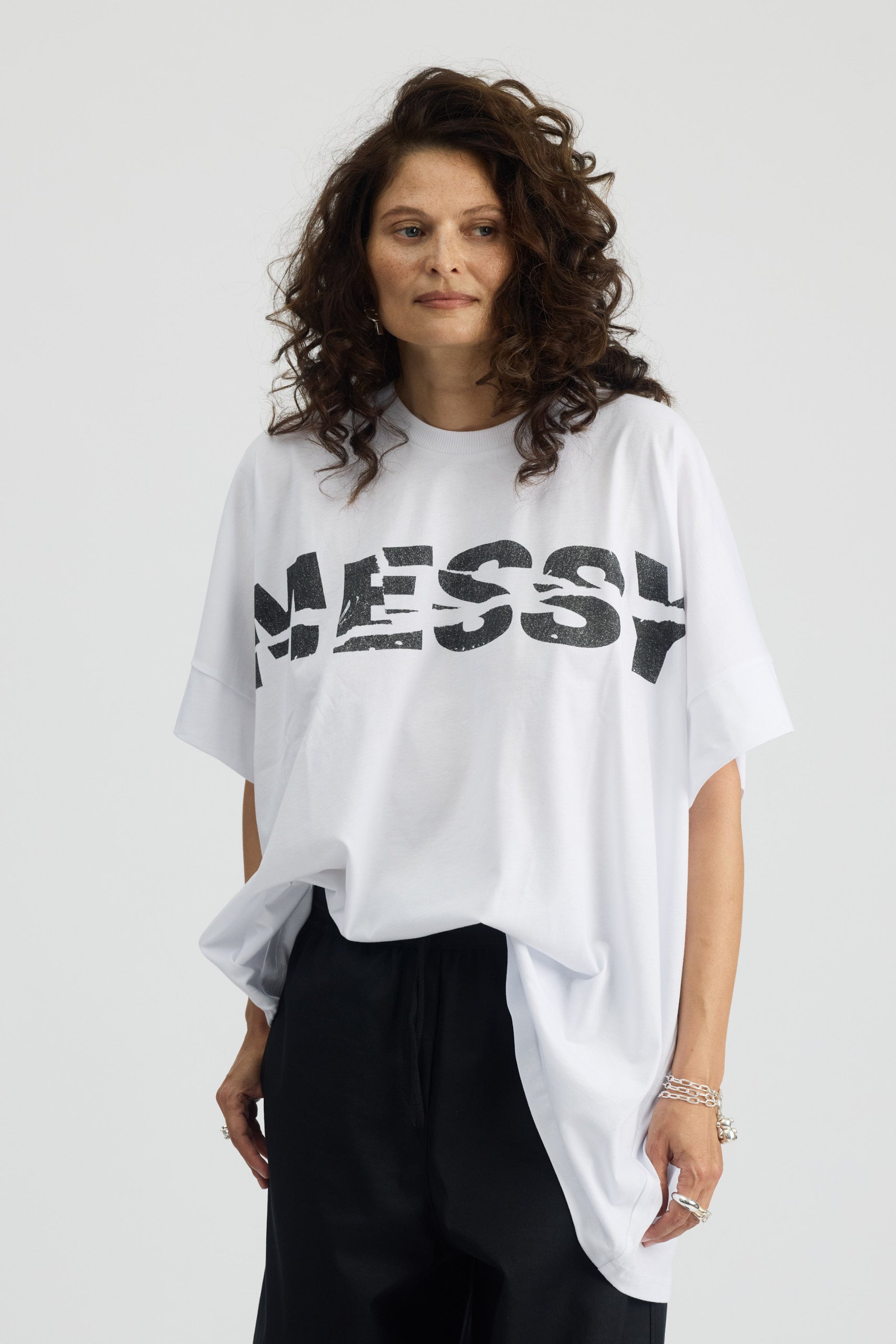 • T-shirt oversize z printem MESSY. Może być noszony jak luźny t-shirt lub tunika. Lekka forma nadaje zwiewności całej sylwetce.