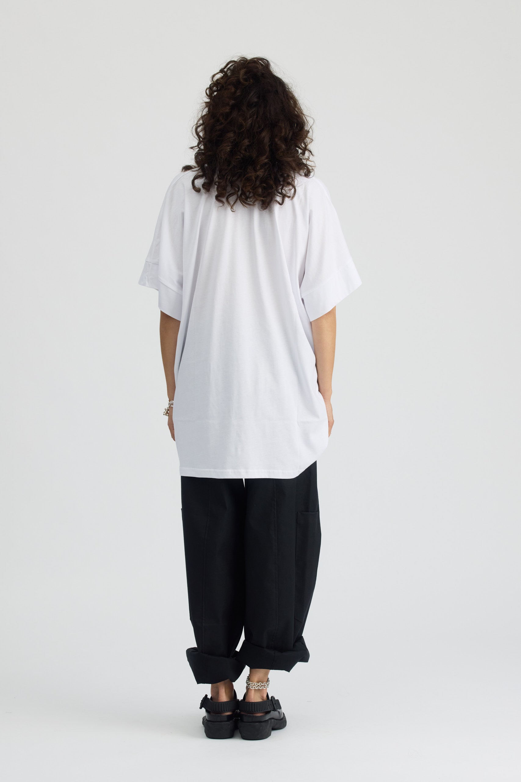 T-shirt oversize z printem MESSY. Może być noszony jak luźny t-shirt lub tunika. Lekka forma nadaje zwiewności całej sylwetce.