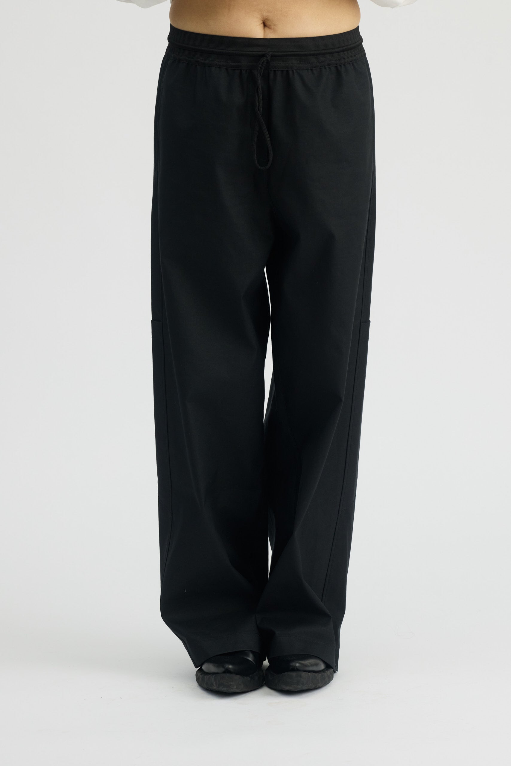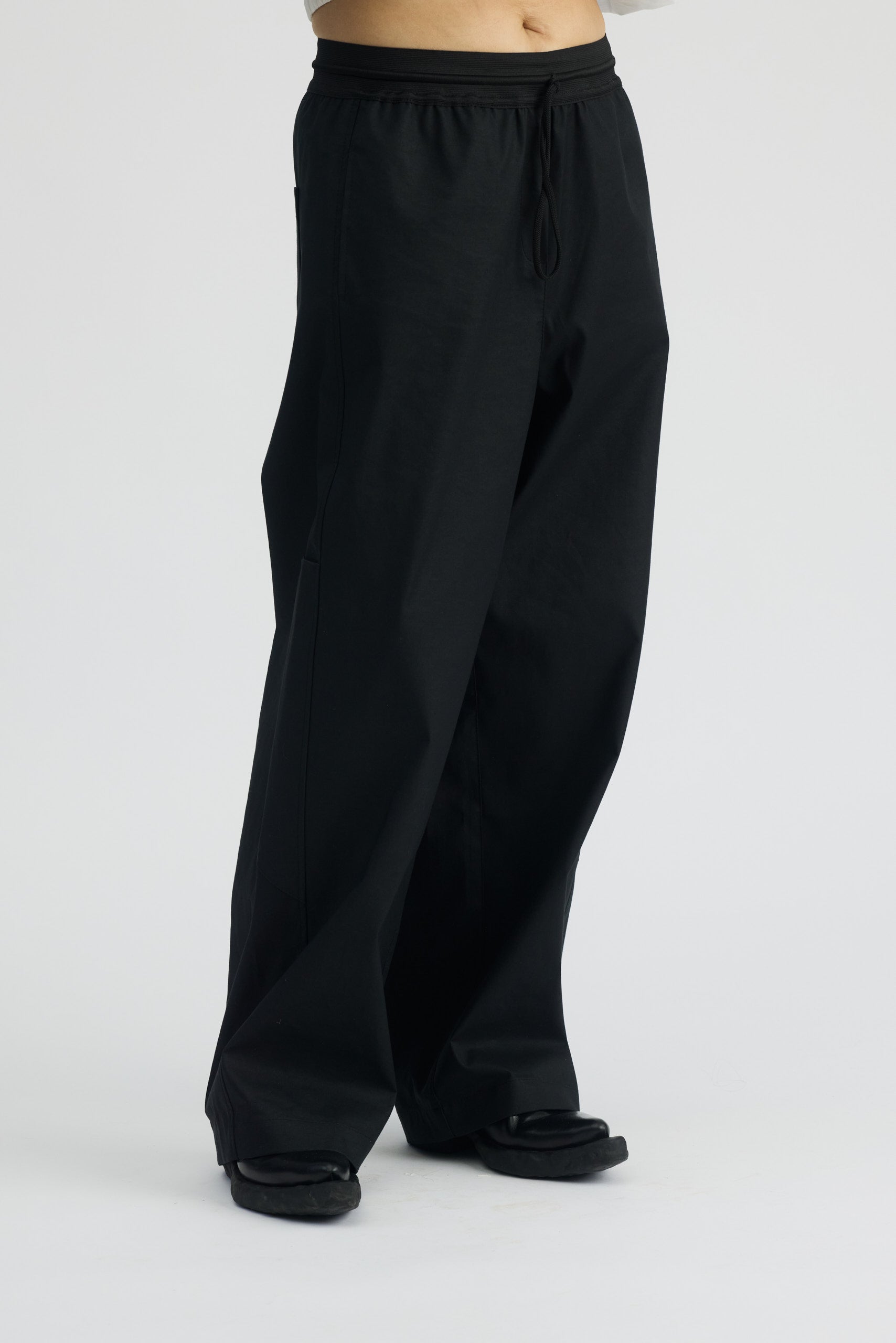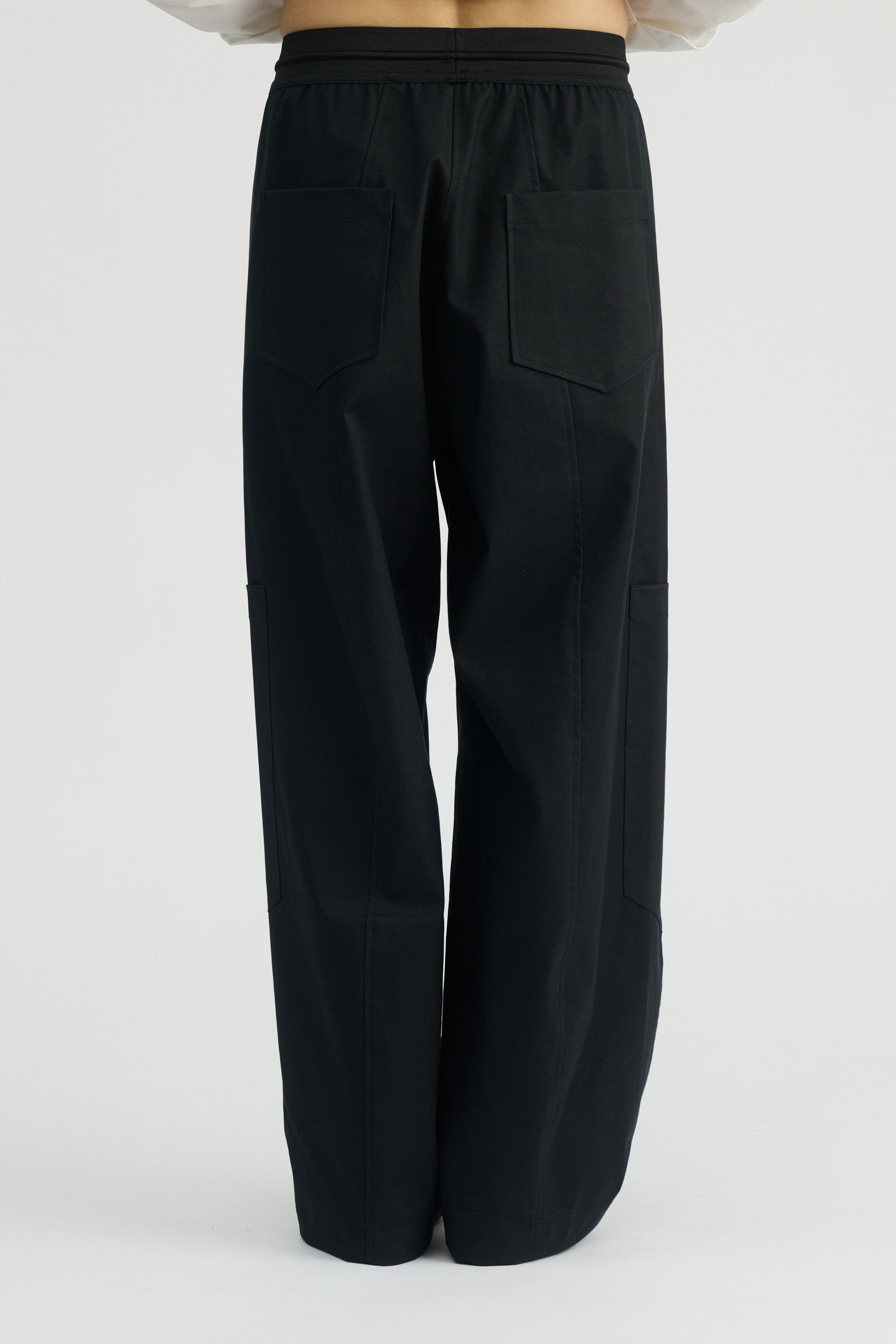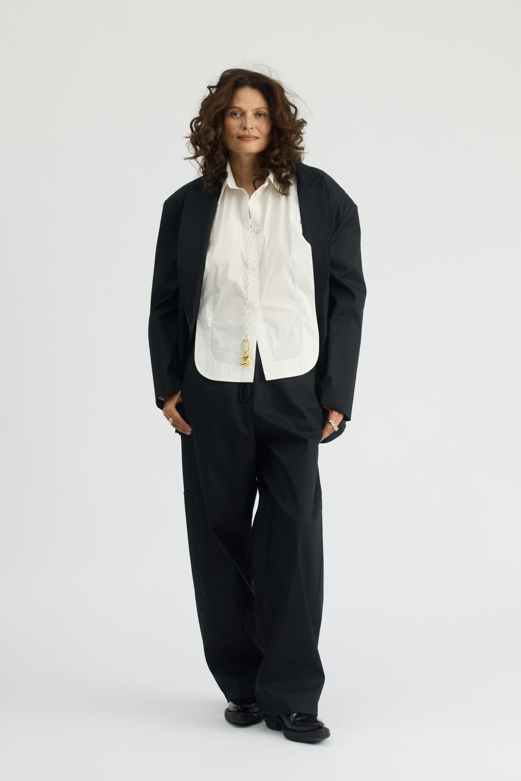 Spodnie o bardzo luźnych, prostych nogawkach, wykonane z lekko usztywnianej tkaniny. Klasyka została przełamana tu ozdobnymi kieszeniami na bokach nogawek dodając im nietuzinkowego charakteru. Zastosowany w pasie ściągacz pozwala dopasować je do każdej sylwetki i nadaje im bardziej sportowego charakteru.