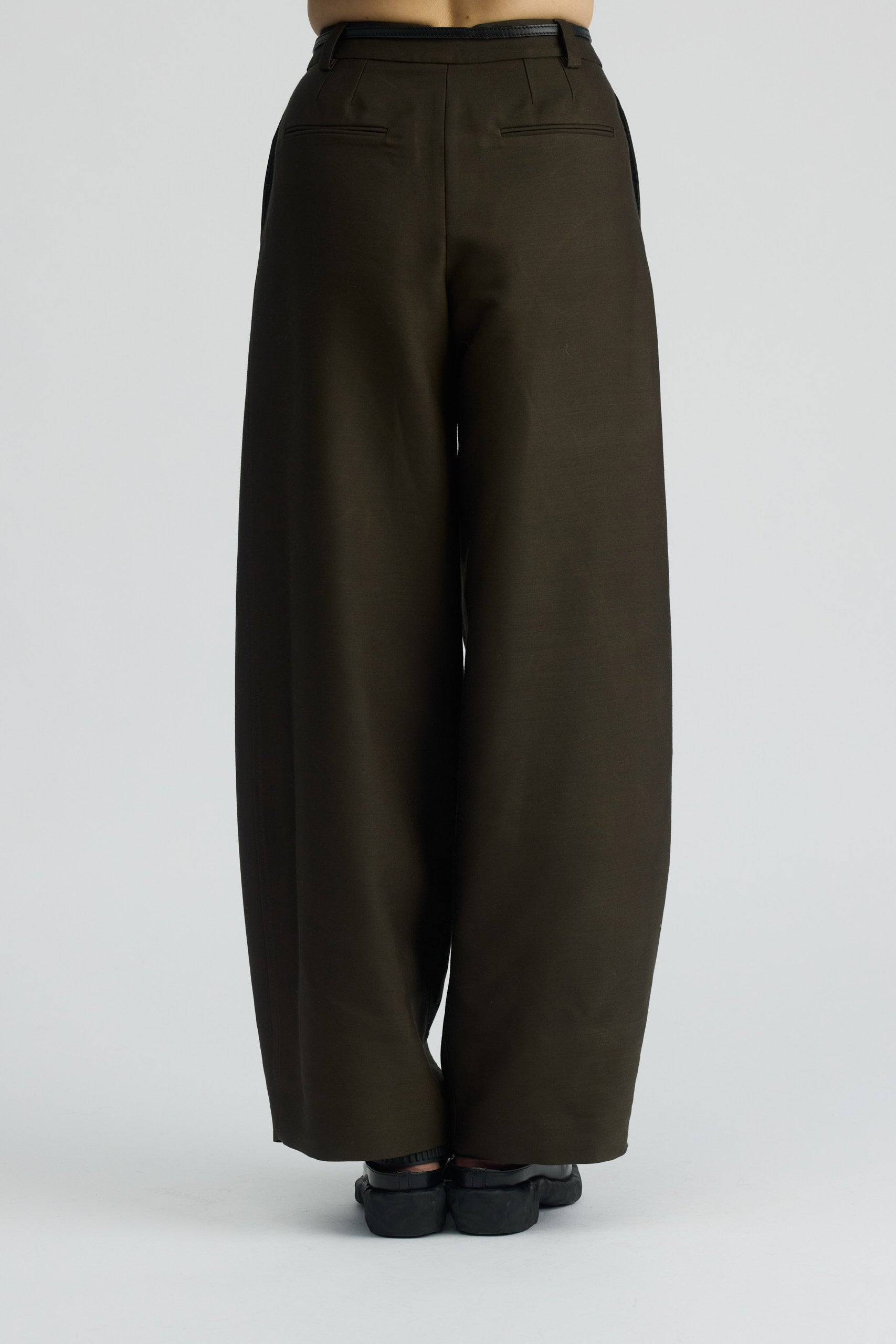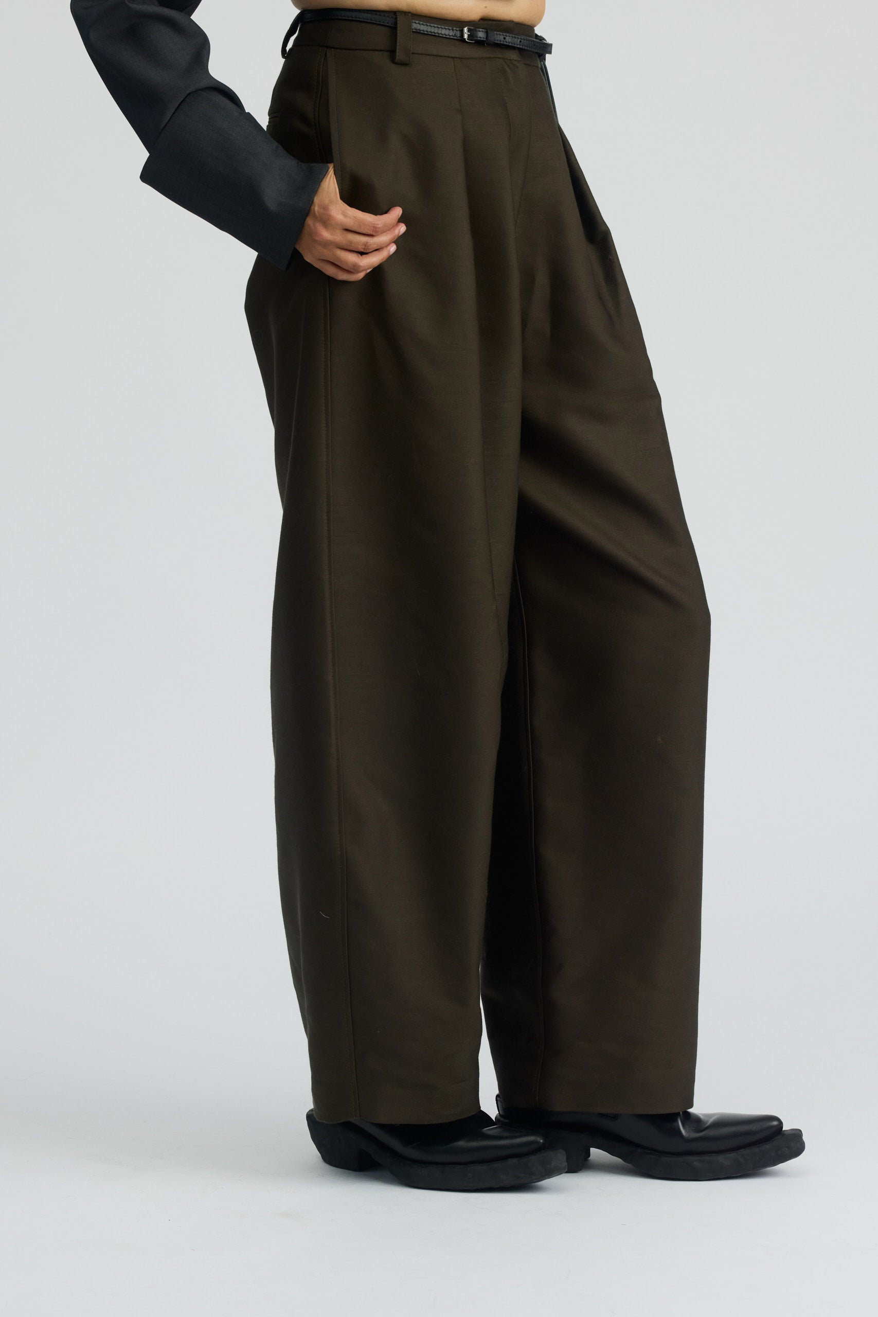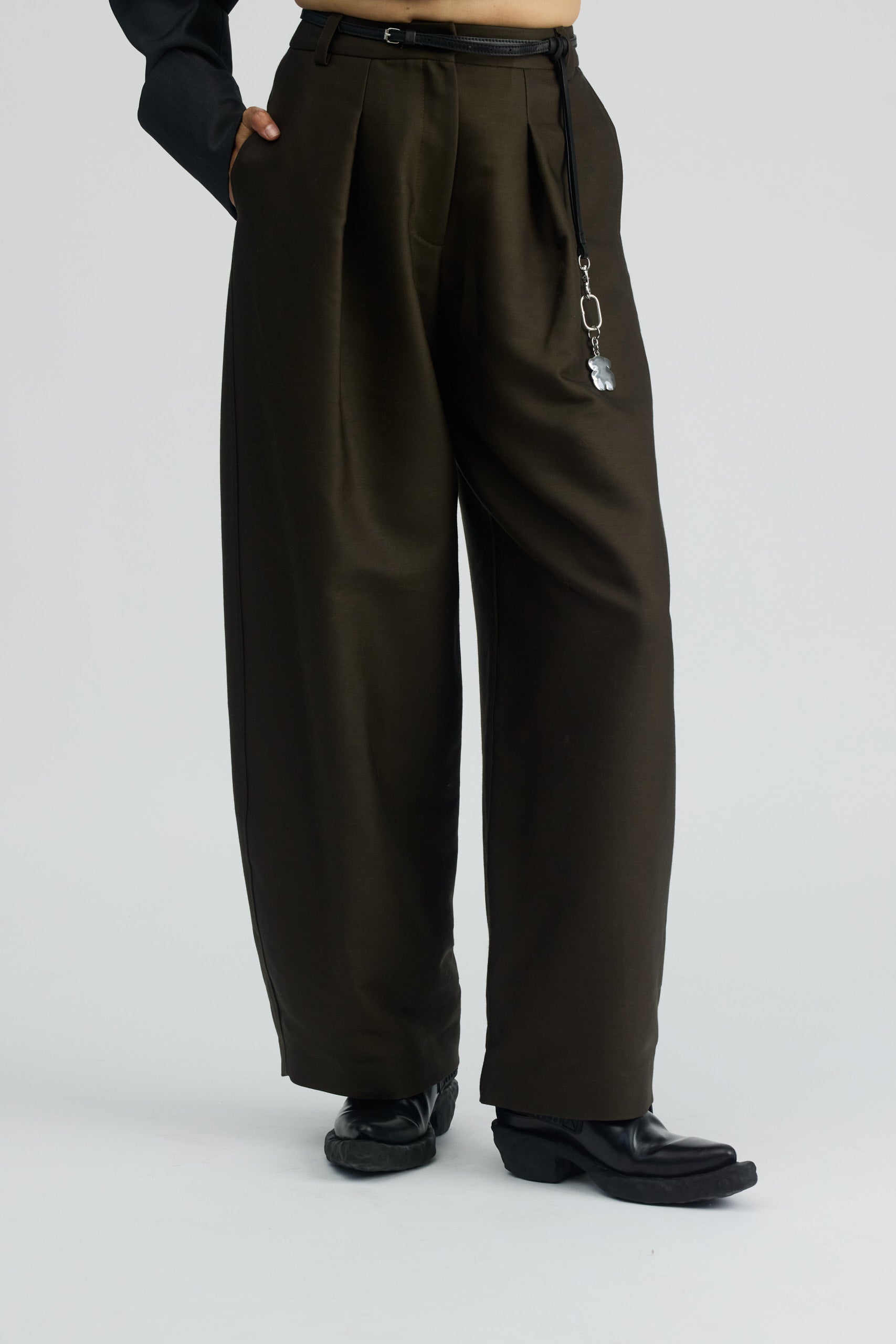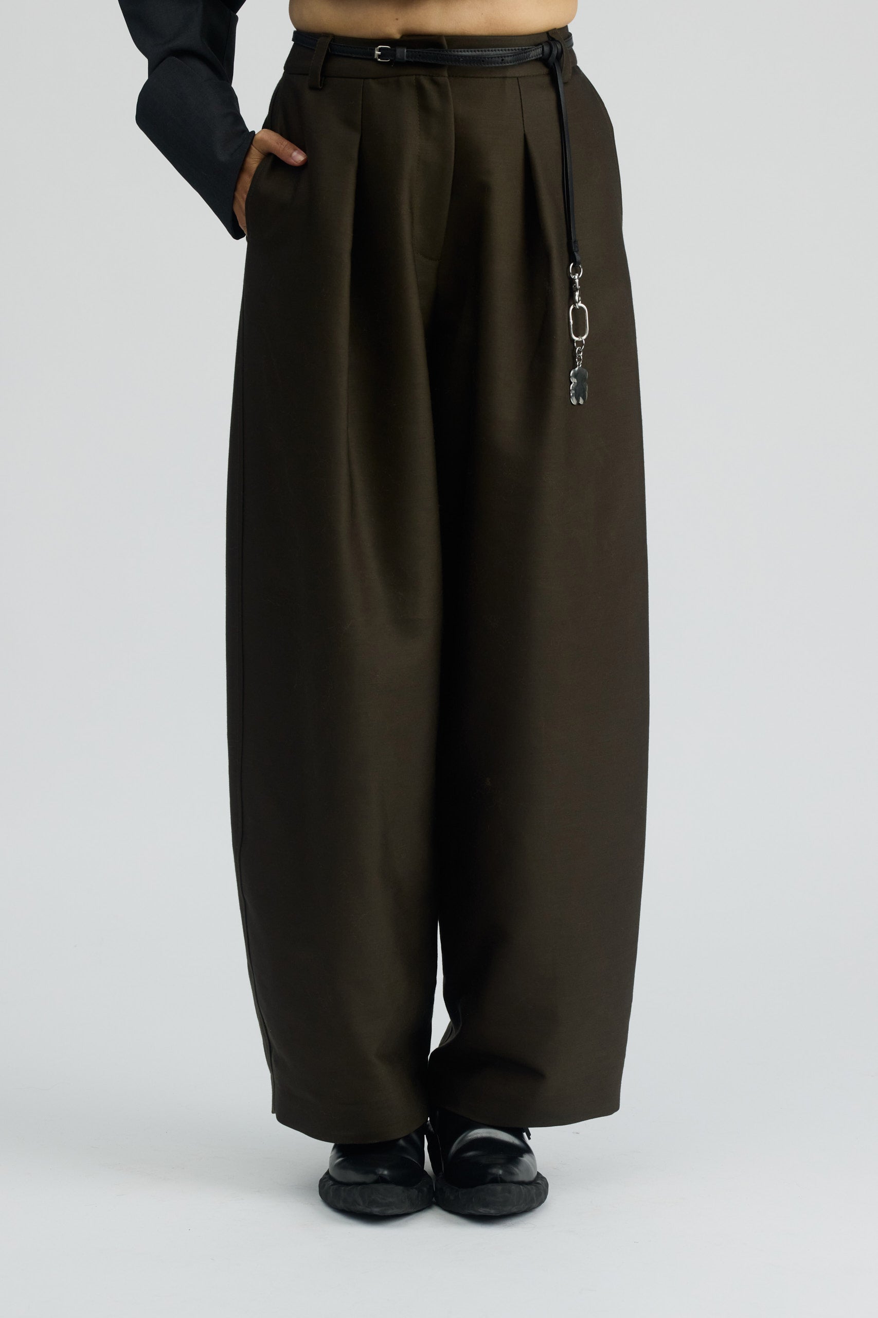Spodnie o szerokim kroju z kieszeniami. Swobodne nogawki z zakładką nie krępują ruchów i nadają lekkości. Z tyłu na tali niewielkie wycięcie w kształcie litery V.