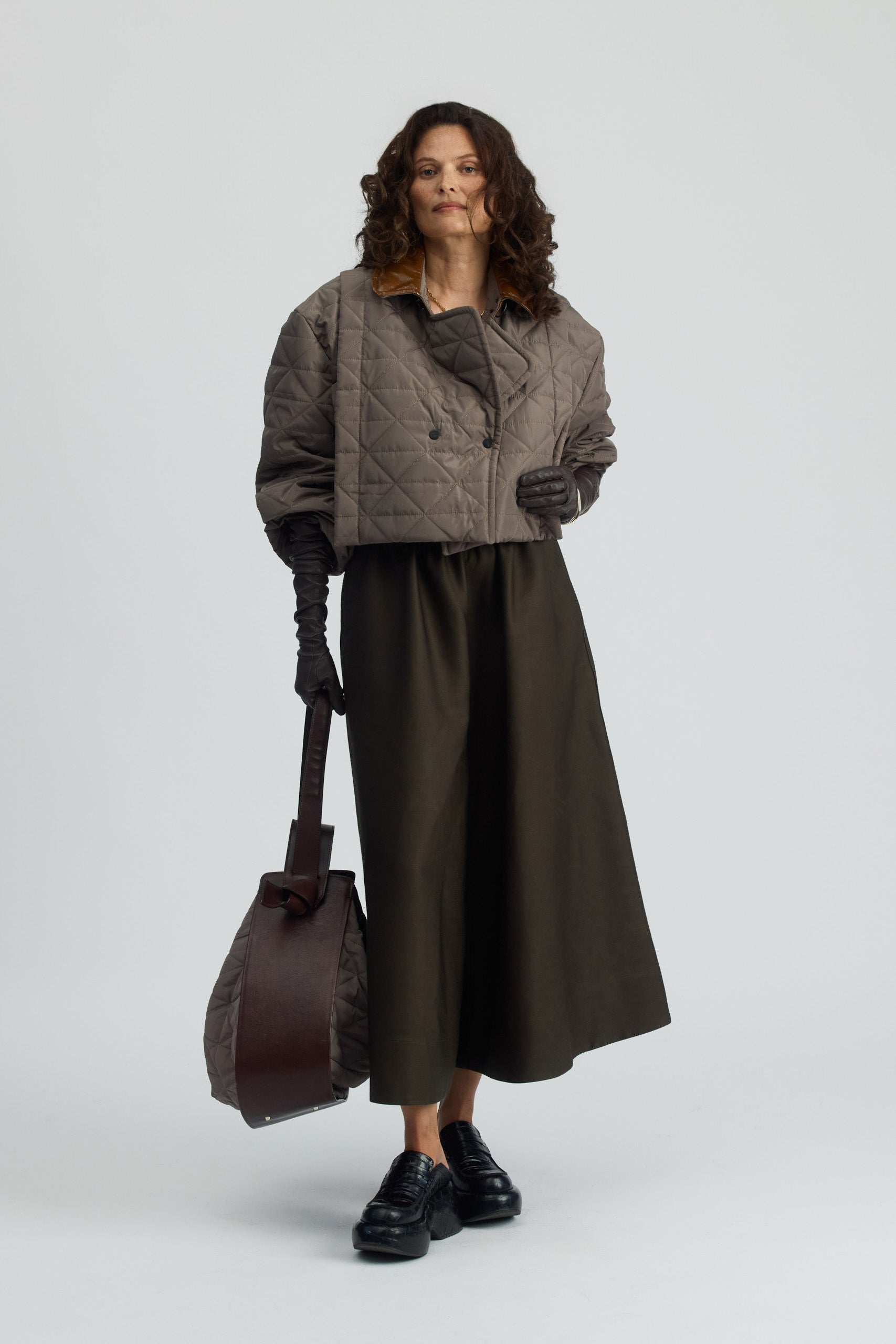Krótka kurtka z pikowanego materiału, wykończona syntetyczną skórą w odcieniu mlecznej czekolady. Charakterystyczna faktura tkaniny, ozdobne plisy oraz zapięcia na napy nadają jej nietuzinkowy charakter. Dodatkowym atutem są ukryte w plisach, praktyczne kieszenie.