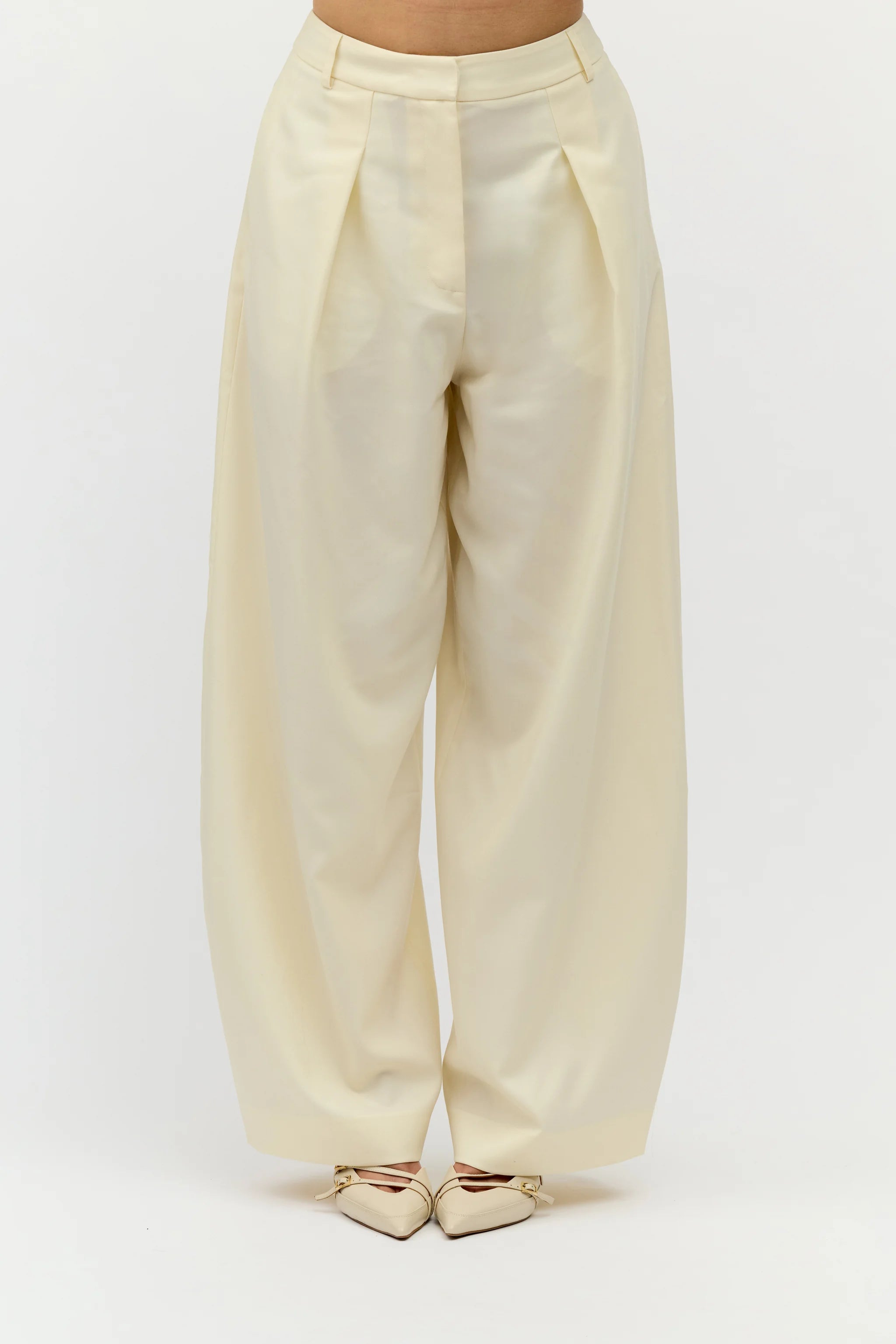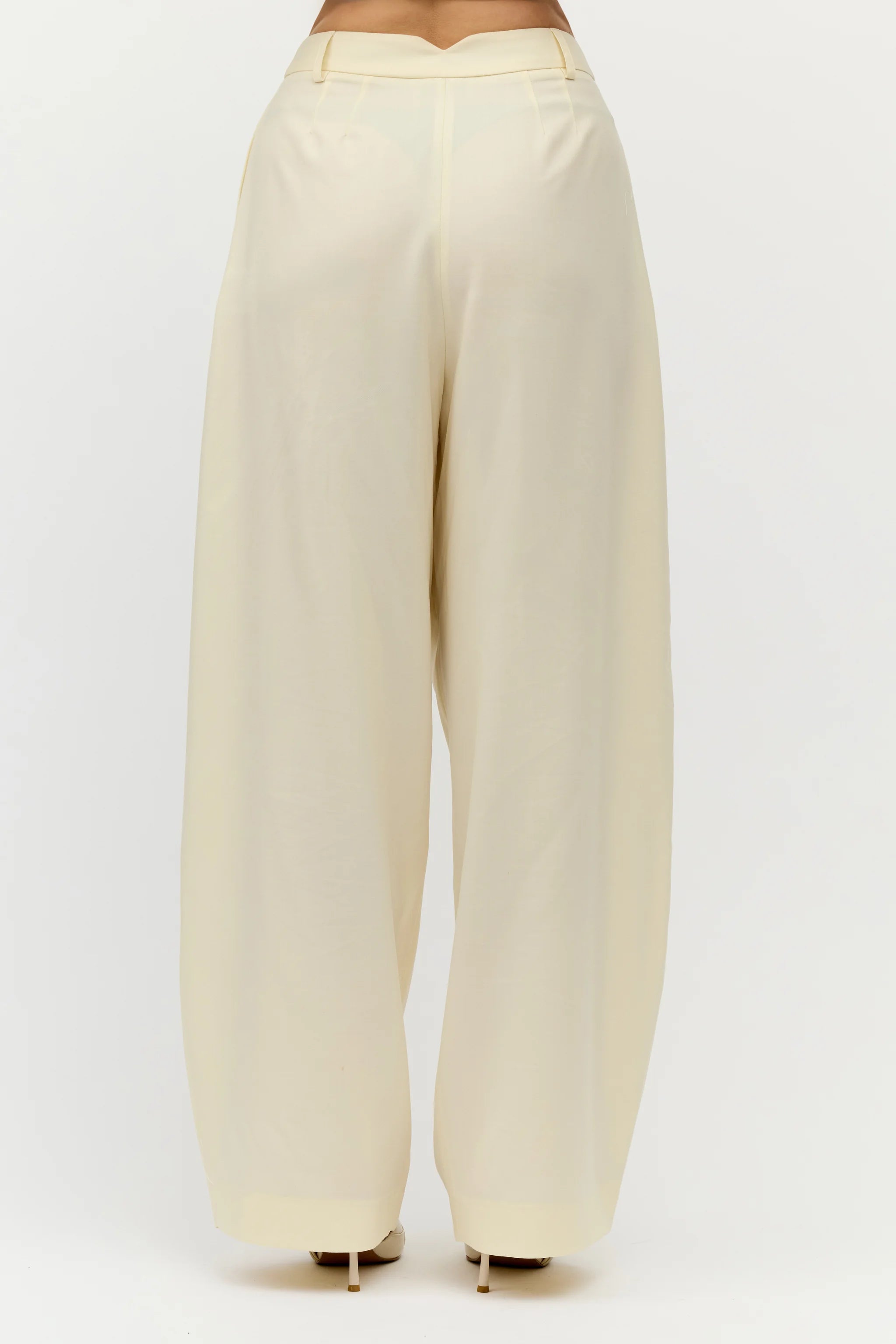 Spodnie z wycięciem w kształcie litery V z tyłu pasa. Subtelny detal podkreśla linię sylwetki i nadaje formie wyrazistości. Swobodne nogawki w kant z zakładką nie krępują ruchów i wprowadzają lekkość do formalnego fasonu.