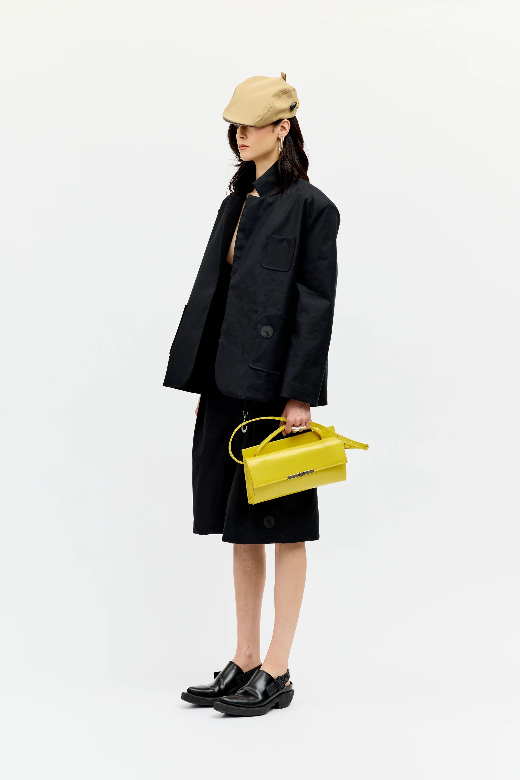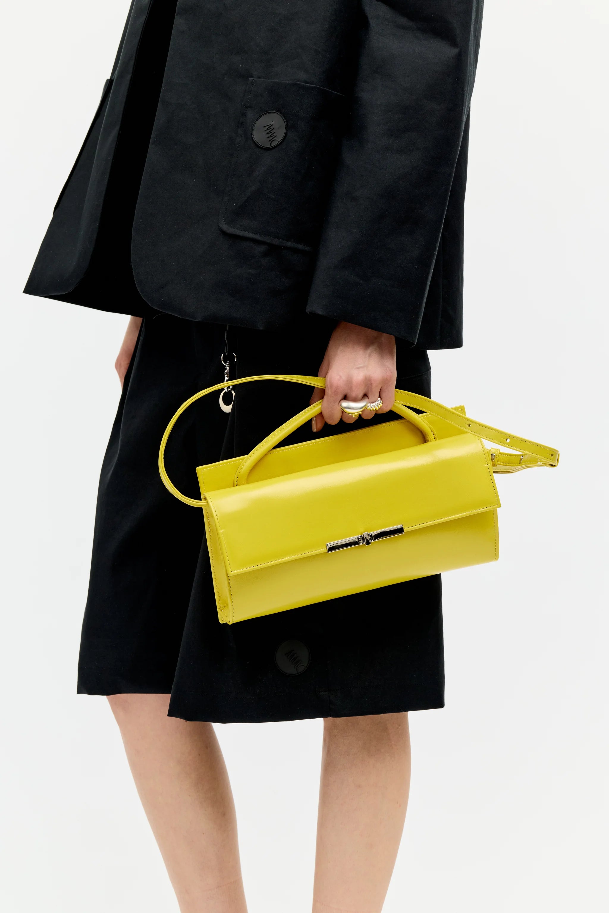 Skórzana torebka w intensywnym żółtym kolorze. Rączka i regulowany pasek zapewniają różne opcje noszenia, a zewnętrzna kieszeń i magnetyczne zapięcie łączą funkcjonalność z elegancją.