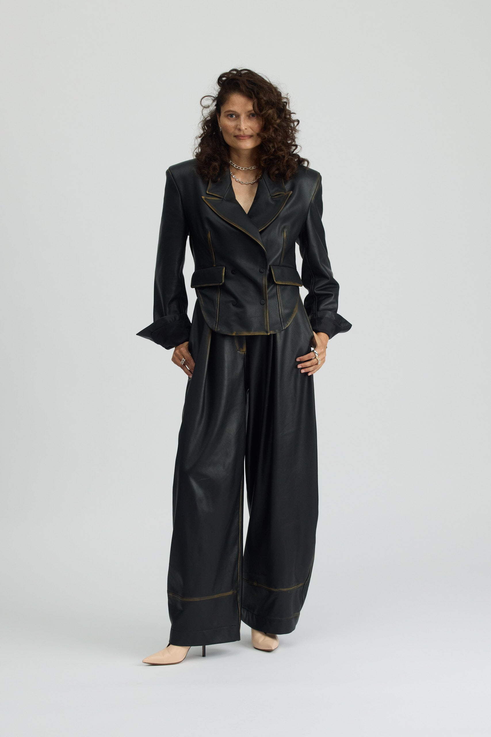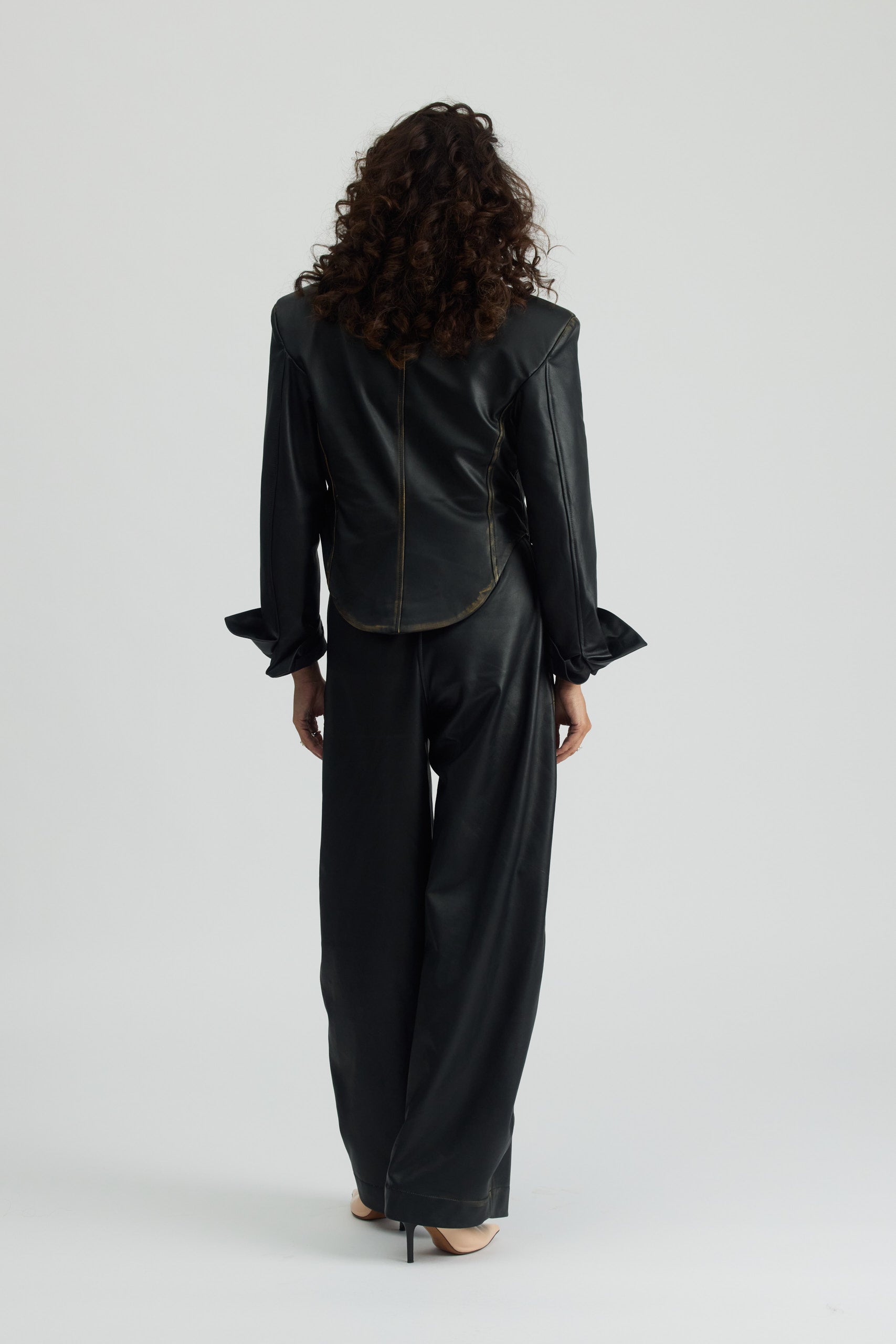 Eleganckie skórzane spodnie o luźnym fasonie. Każda sztuka jest ręcznie przecierana przez co staje się niepowtarzalna i może różnić się od tej pokazanej na zdjęciach.