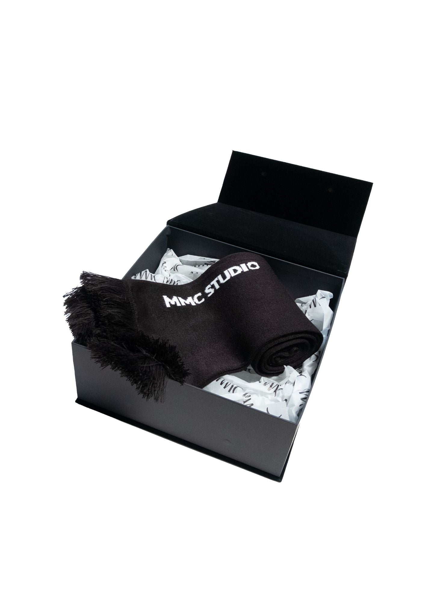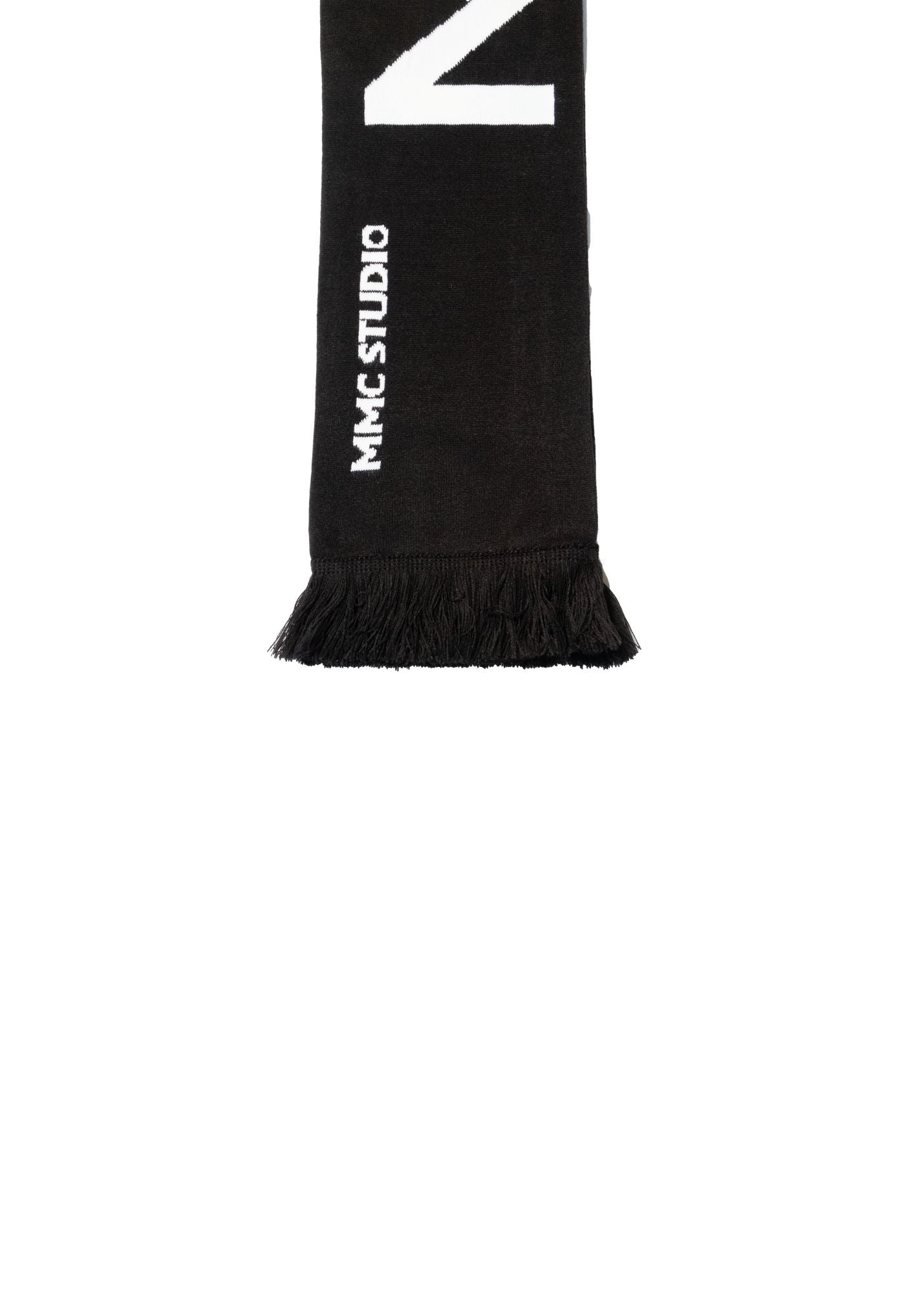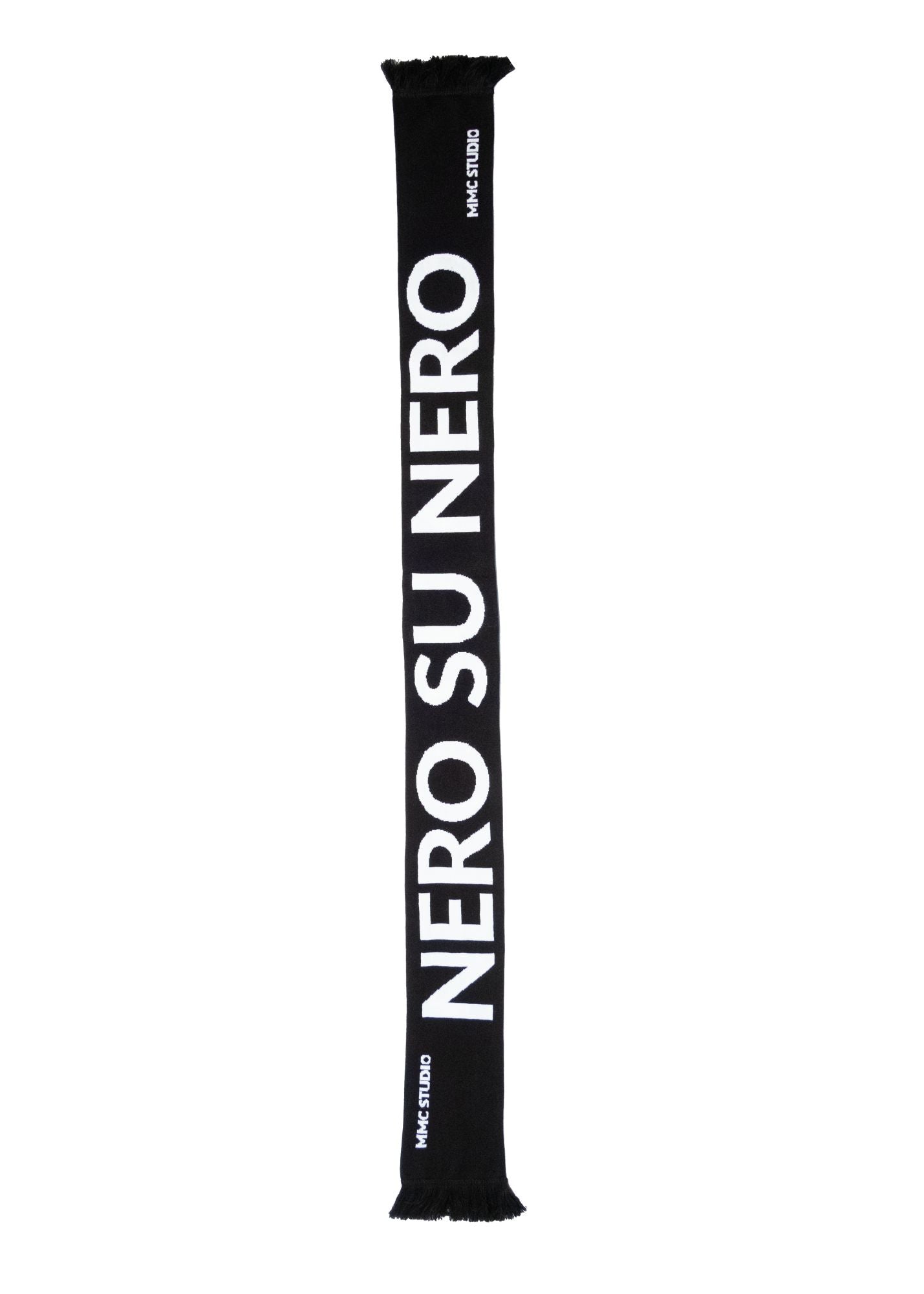 Szalik z frędzlami z hasłem najnowszej kolekcji "NERO SU NERO"